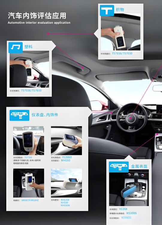為了滿(mǎn)足消費(fèi)者對(duì)汽車(chē)漆面外飾件和內(nèi)飾色彩的高要求,三恩時(shí)引入了先進(jìn)的色彩管理工具—MS3005多角度色差儀,為汽車(chē)涂漆與內(nèi)飾色彩測(cè)試提供精準(zhǔn)解決方案。