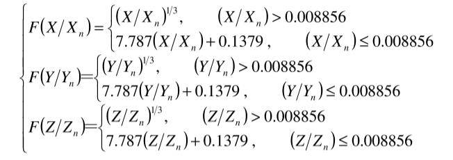 CIELab是CIE1976L*a*b*均勻顏色空間的簡(jiǎn)稱,是由CIEXYZ色度系統(tǒng)經(jīng)過非線性轉(zhuǎn)換得到的,它用明度指數(shù)L*,色品指數(shù)a*和b*構(gòu)成的三維坐標(biāo)系統(tǒng)來表示顏色感覺,其轉(zhuǎn)換公式如下: